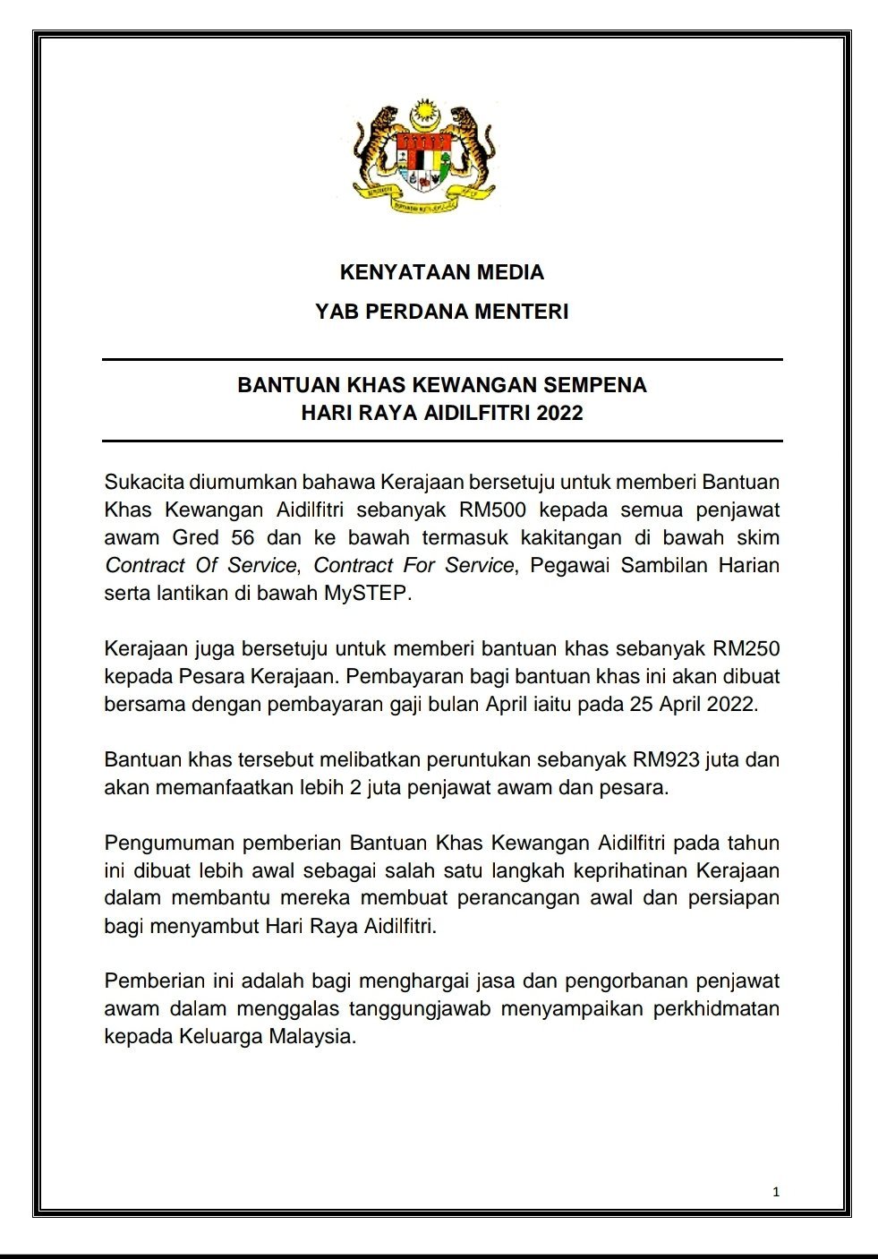 . Bayaran Bantuan Khas 2016 Penjawat Awam Sabah Dapat Duit Raya Tarikh Bayaran Khas Rm500 Bagi Penjawat Awam 2020 Adalah Pada 23 April 2020 Mengikut Pekeliling Rahmatsindala. Perdana Menteri Datuk Seri Najib Razak hari ini mengumumkan pemberian Bantuan Khas Kewangan sebanyak RM 500 kepada 16 juta penjawat awam sebagai persiapan menyambut Hari Raya Aidilfitri 2016. Penjawat Awam Gred 56 ke Bawah.